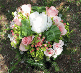 皇后陛下へのプレゼンテーションブーケ白のしゃくやくを中心にエンプレスミチコに似たコーラルピンクのバラとハートを繋ぐ、ハートかずらをあしらいました。 しゃくやく:白雪姫 バラ :トワサンセット他、 |